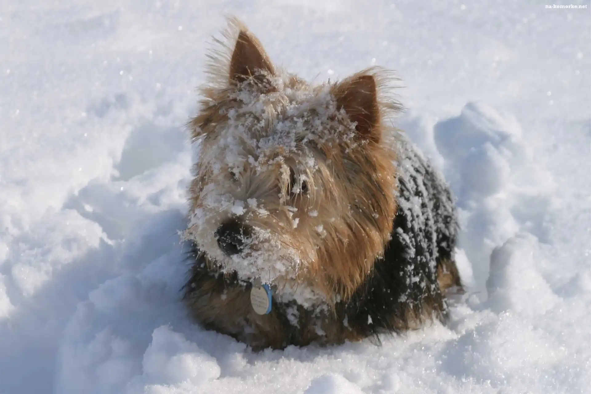 Norwich terrier, śnieg na Komórkę