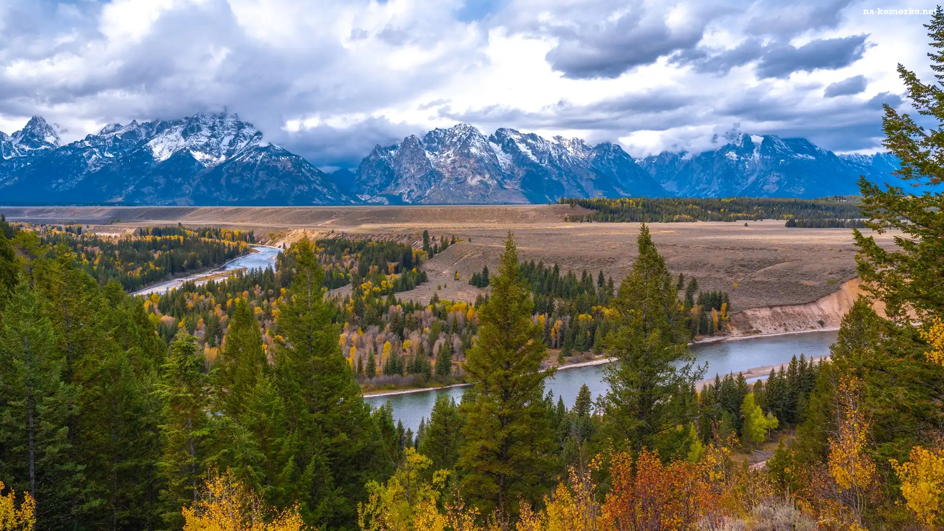Teton Range, Park Narodowy Grand Teton, Chmury, Las, Stany Zjednoczone, Góry, Stan Wyoming, Drzewa, Rzeka Snake River na Komórkę |