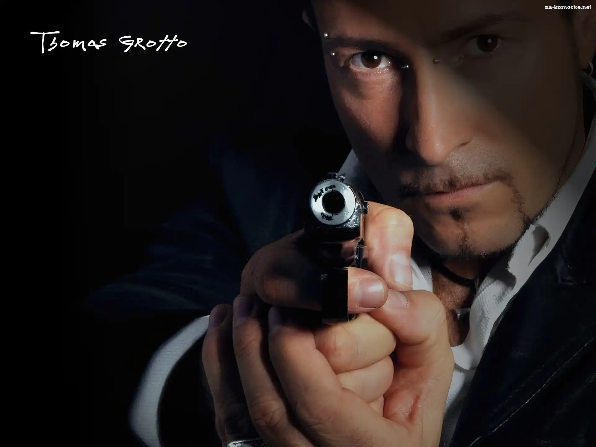 Thomas Grotto, Wycelowany, Pistolet Thomas Grotto, Tatuaż, Kolczyki Thomas Grotto, Okulary Thomas Grotto, Kapelusz, Tatuaż Thomas Grotto, Pistolet Thomas Grotto, Papieros Thomas Grotto