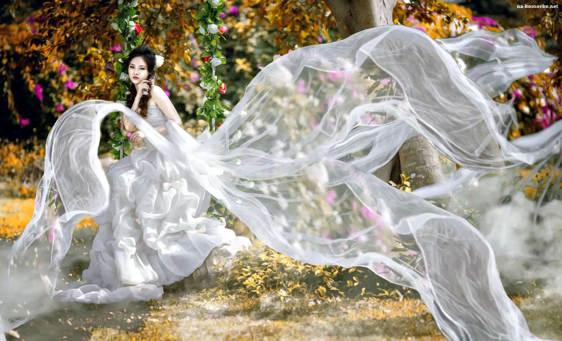 Tiul, Azjatka, Dziewczyna, Ogród, Suknia, Kwiaty na Komórkę