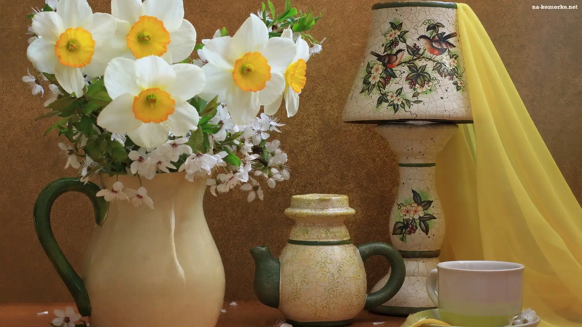 Tkanina, Dzbanki, Lampka, Filiżanka, Narcyze na Komórkę