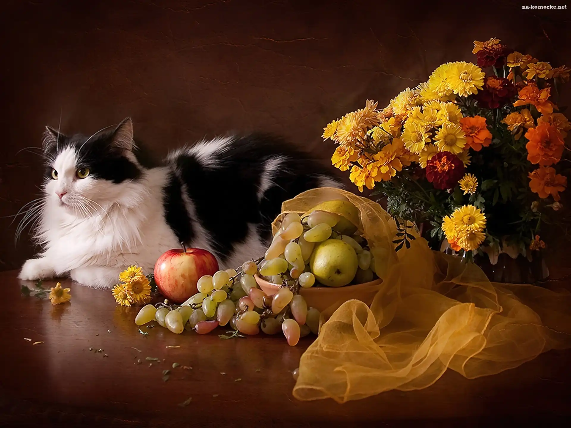 Tkanina, Kot, Bukiet, Kwiatów, Owoce na Komórkę