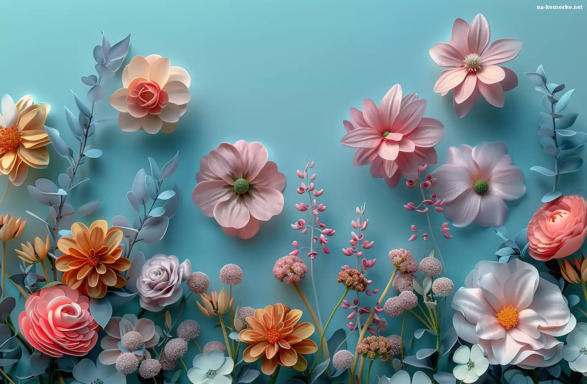 Niebieskie, Różowe, Liście, Tło, Kwiaty, Pomarańczowe na Komórkę