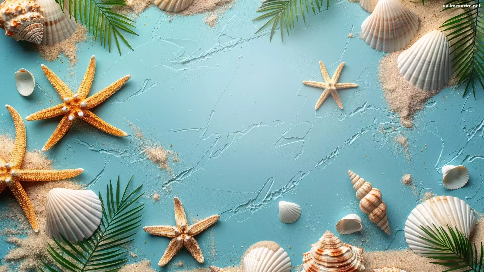 Niebieskie, Muszelki, Piasek, Tło, Liście, Rozgwiazdy na Komórkę