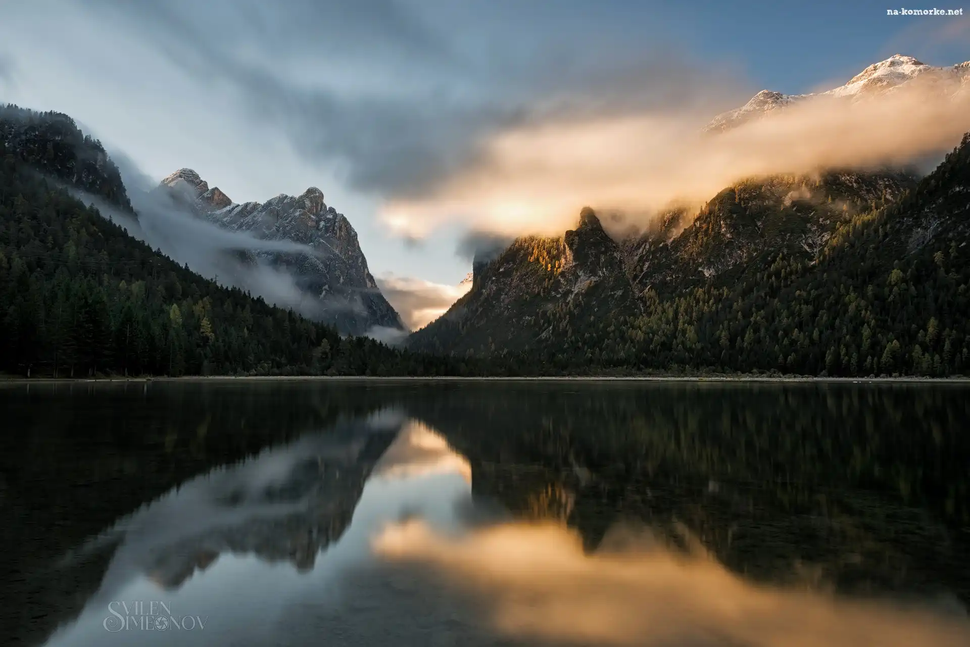 Drzewa, Góry, Chmury, Jezioro Toblacher See, Włochy, Dolomity, Prowincja Bolzano, Lago di Dobbiaco, Odbicie na Komórkę |