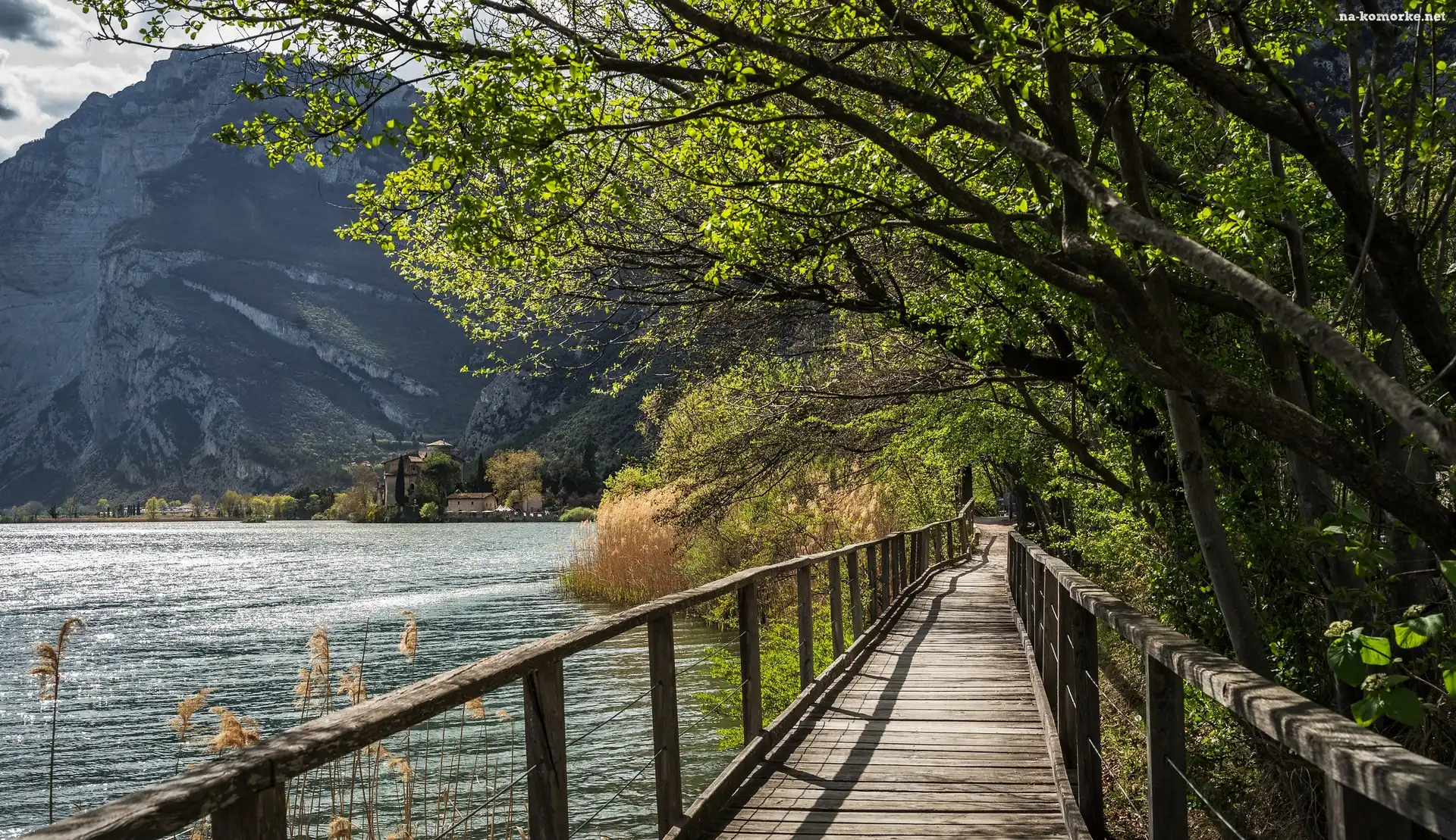 Góry, Jezioro, Drzewa, Włochy, Most, Lago di Toblino na Komórkę