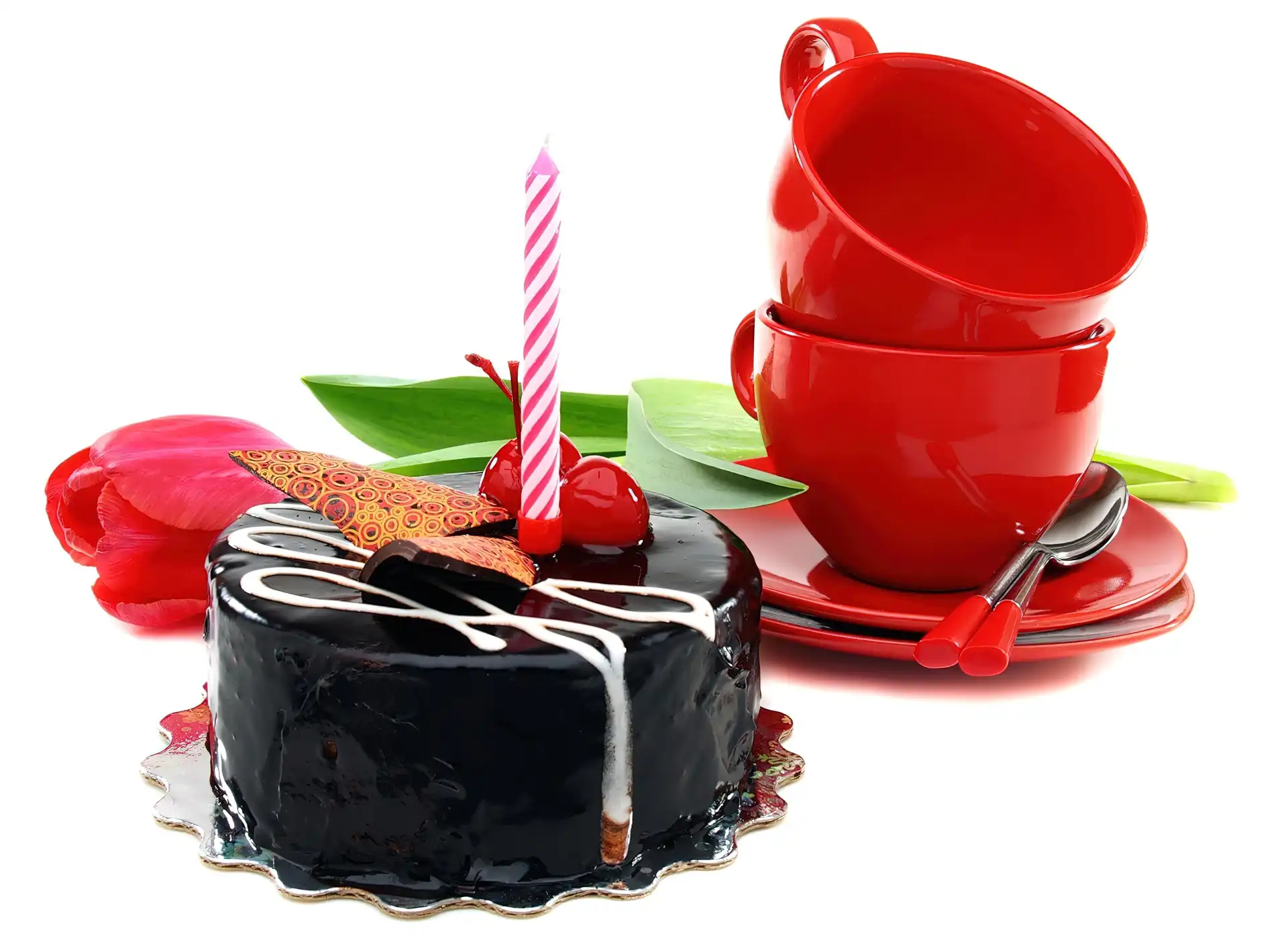 Czerwone, Urodzinowy, Torcik, Tulipany, Świeczka, Filiżanki na Komórkę