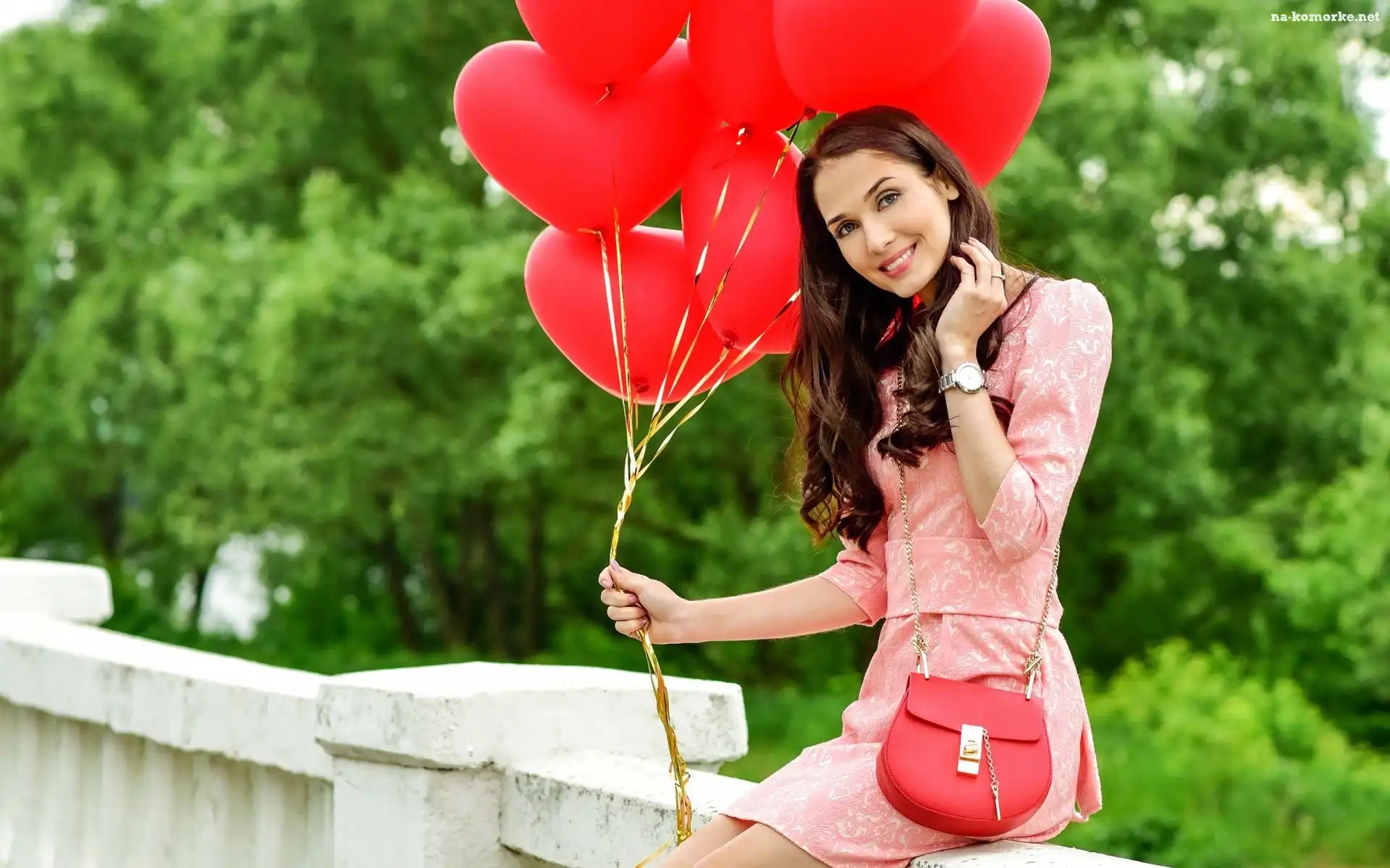 Kobieta, Torebka, Czerwone, Murek, Szatynka, Balony, Zegarek, Czerwona na Komórkę