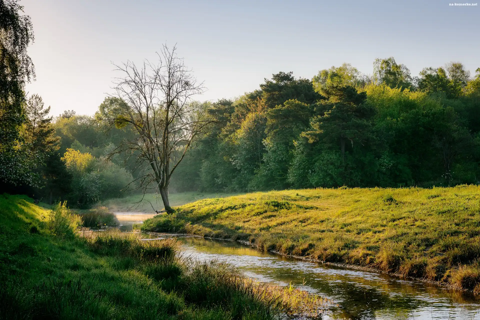 Trawa, Rzeka, Drzewa, Mgła, Łąka, Poranek na Komórkę