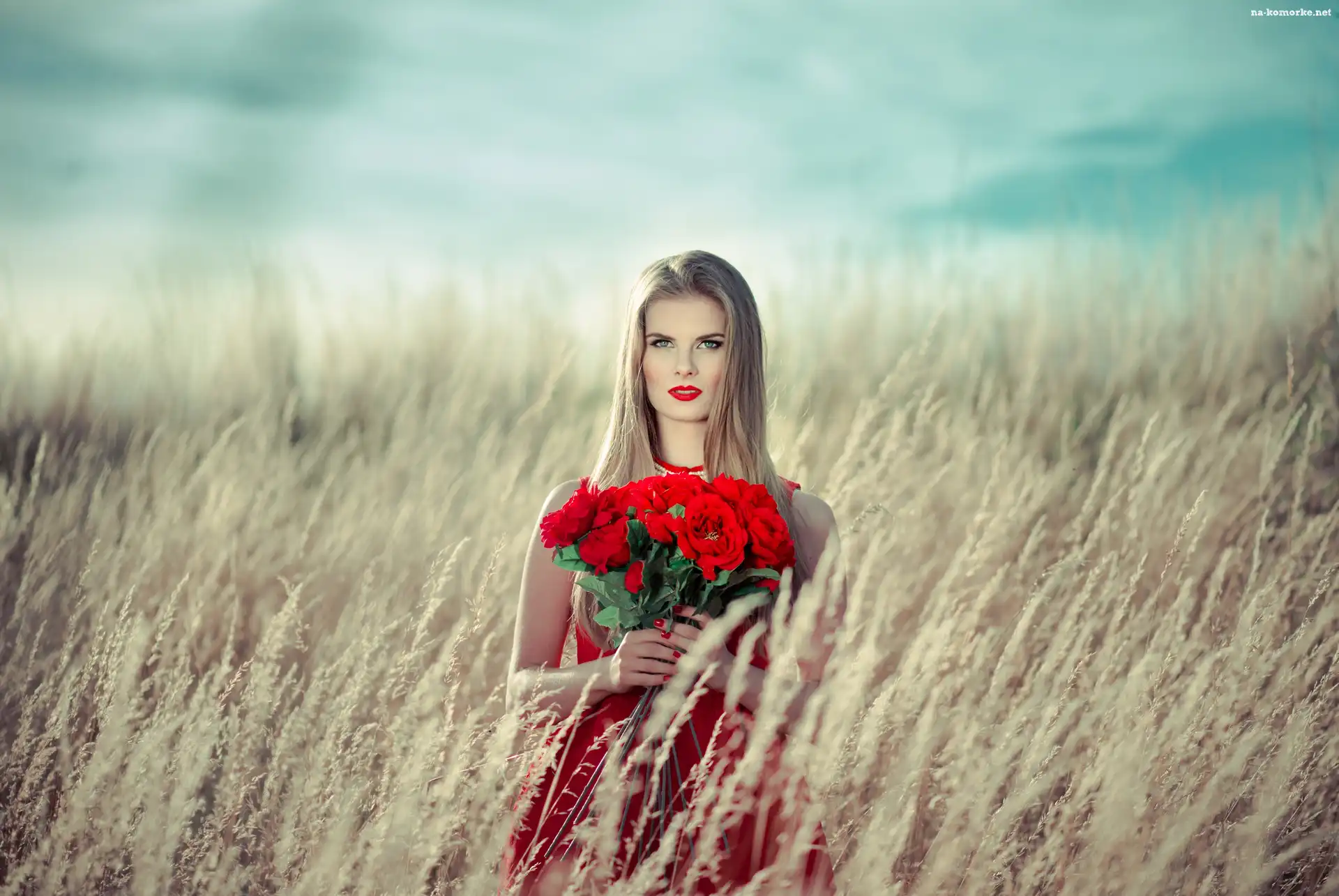 Trawa, Blondynka, Kobieta, Bukiet, Róże na Komórkę