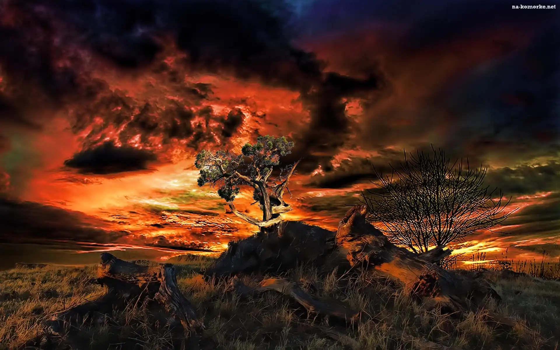 Trawa, Zachód, Słońca, Drzewa, Konary na Komórkę