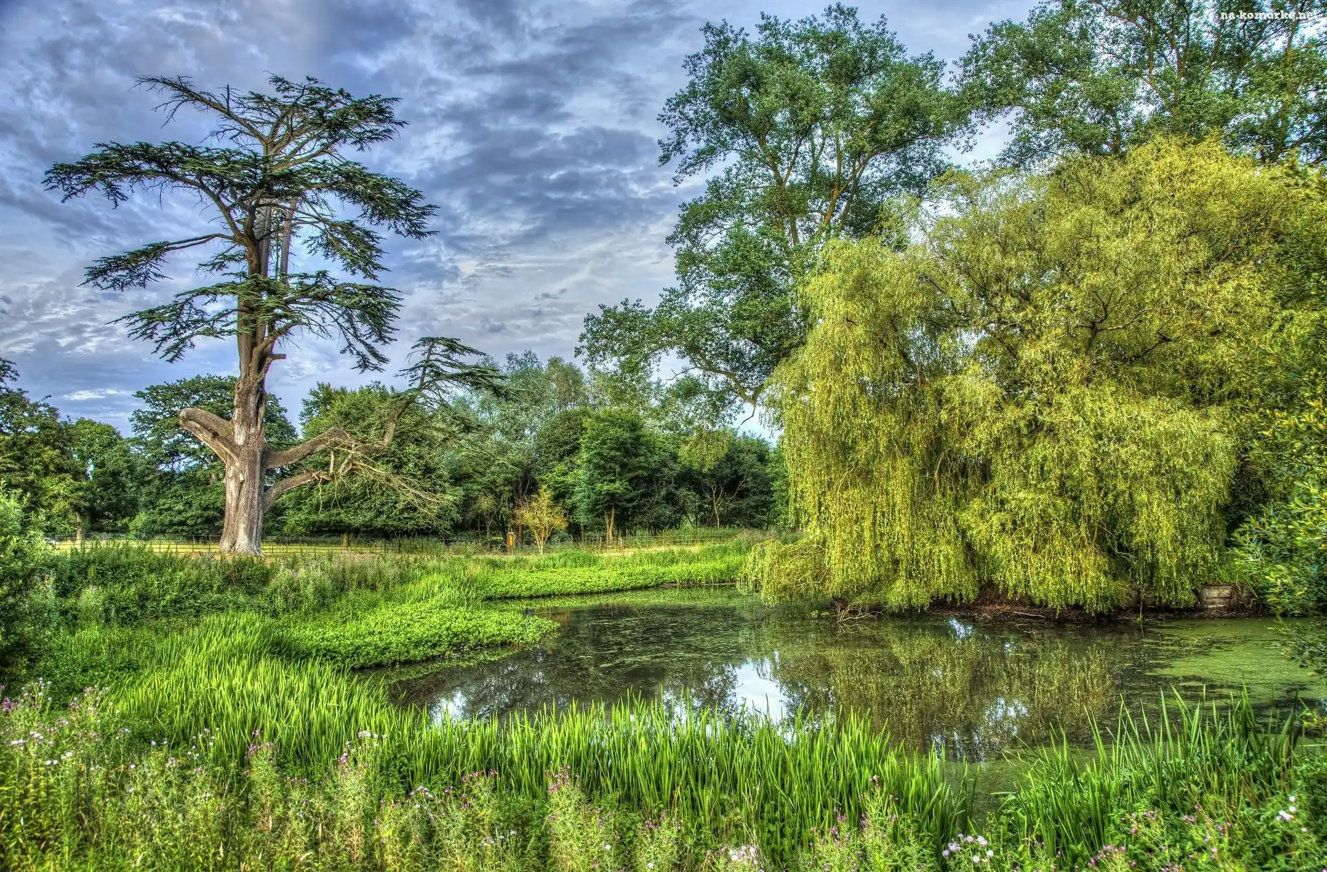 Trawa, Wiosna, Staw, Drzewa, Wierzba na Komórkę