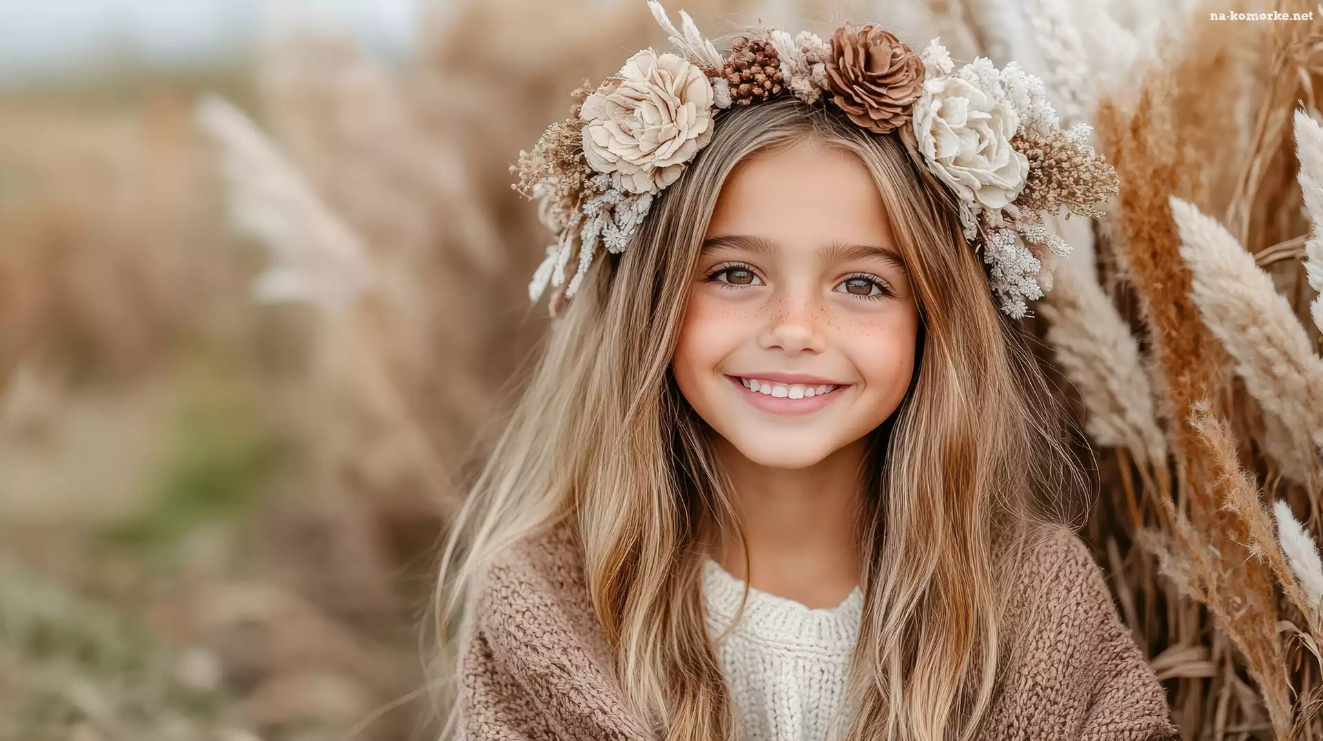Kwiaty, Uśmiechnięta, Wianek, Trawa, Blondynka, Dziewczynka na Komórkę
