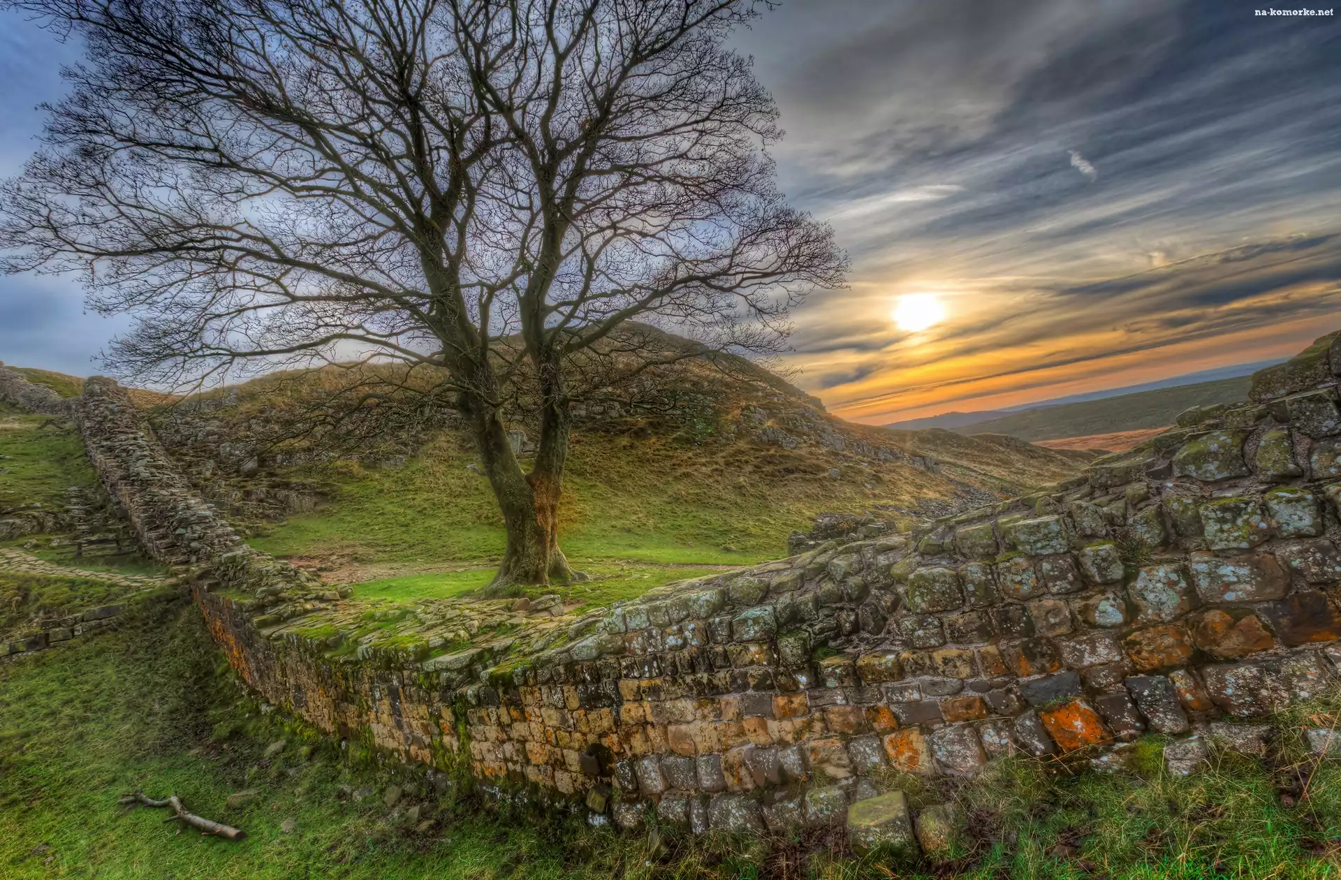 Drzewo, Wał Hadriana, Anglia, Zachód słońca, Mur Hadriana, Trawa na Komórkę