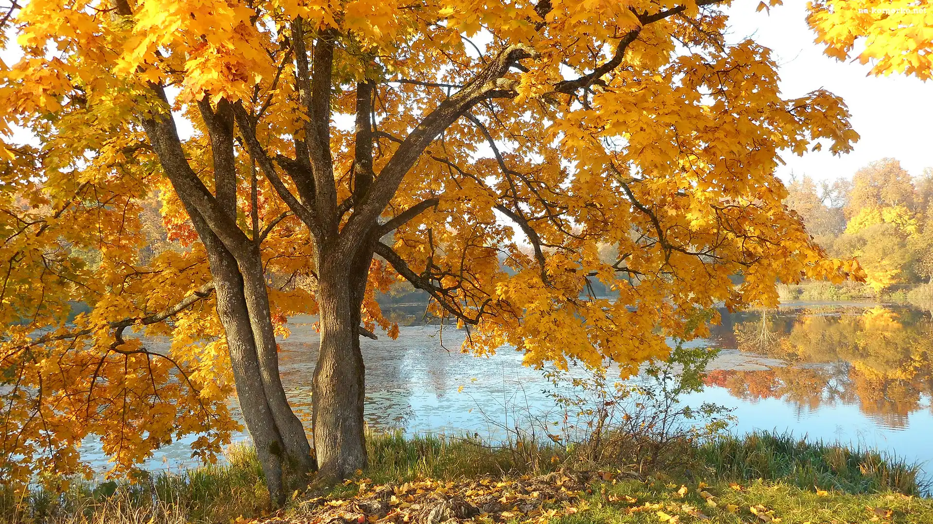 Trawa, Jesień, Drzewo, Klon, Rzeka na Komórkę