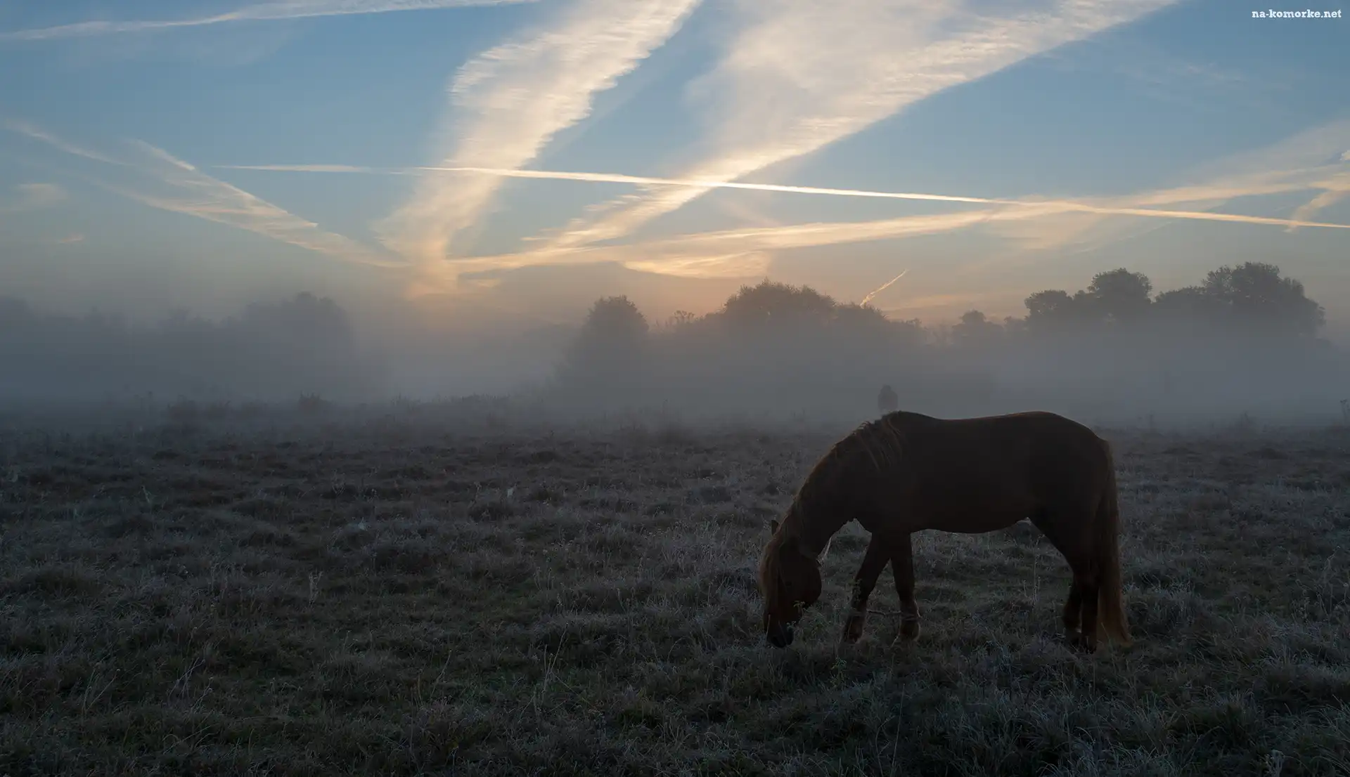 Trawa, Łąka, Mgła, Drzewa, Koń, Szron na Komórkę