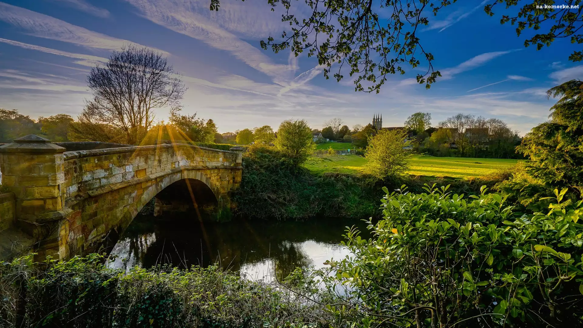 Kamienny, Trawa, Promienie słońca, Most, Rzeka, Drzewa, Krzewy na Komórkę