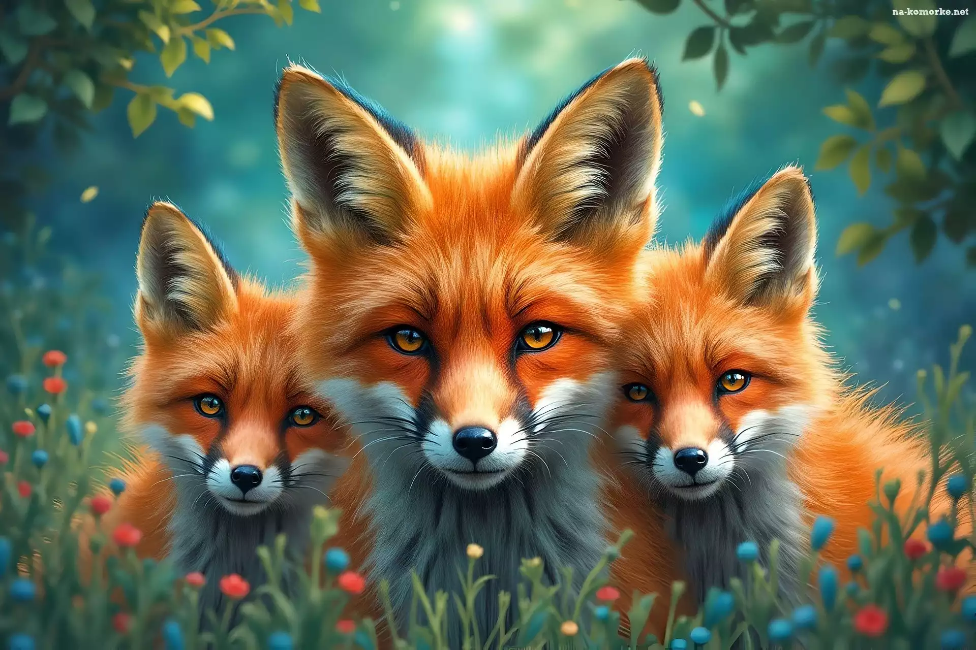 Trzy, Trawa, Kwiaty, Lisy, Grafika na Komórkę