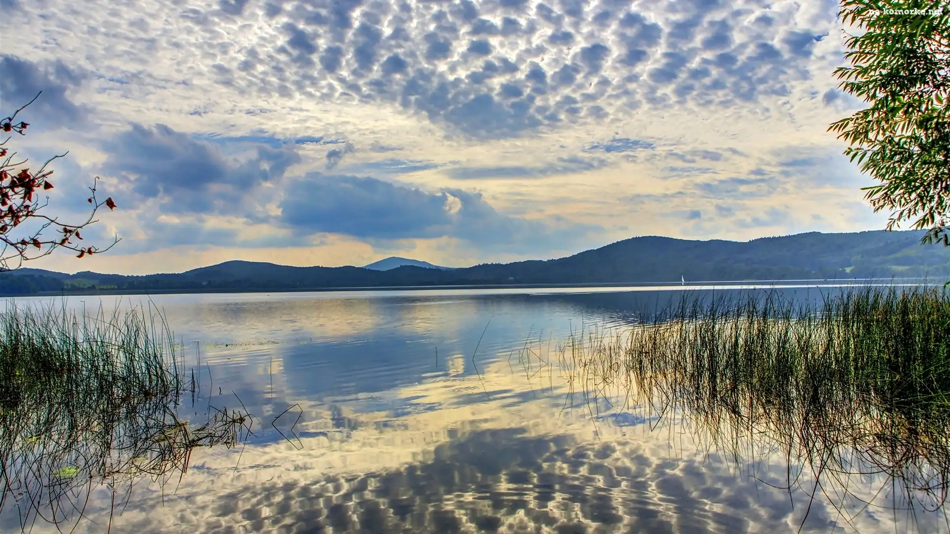 Trawa, Góry, Jezioro, Niebo, Chmury na Komórkę