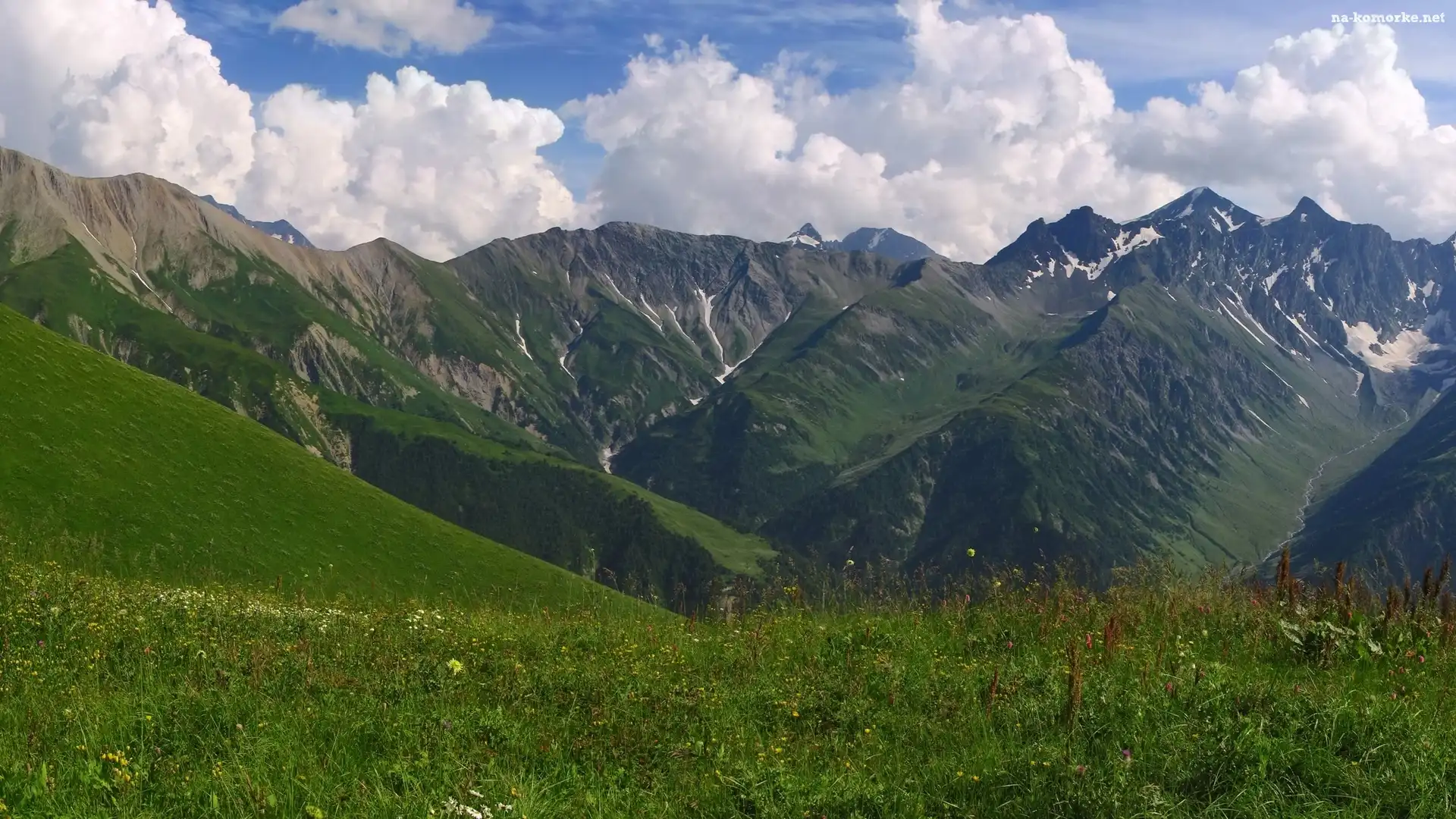 Trawa, Chmury, Góry, Śnieg, Łąka na Komórkę
