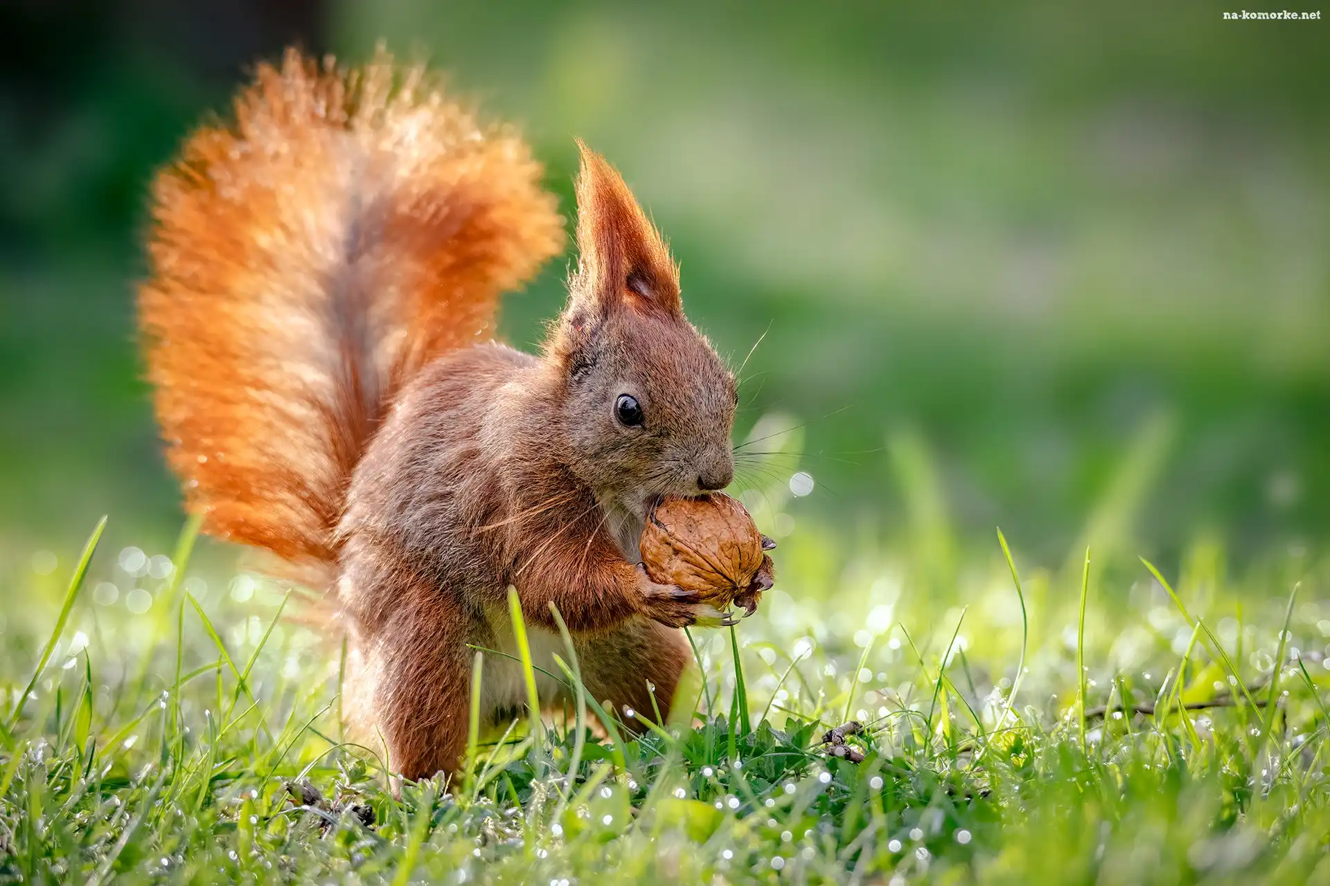 Wiewiórka, Trawa, Rosa, Orzech, Poranek na Komórkę