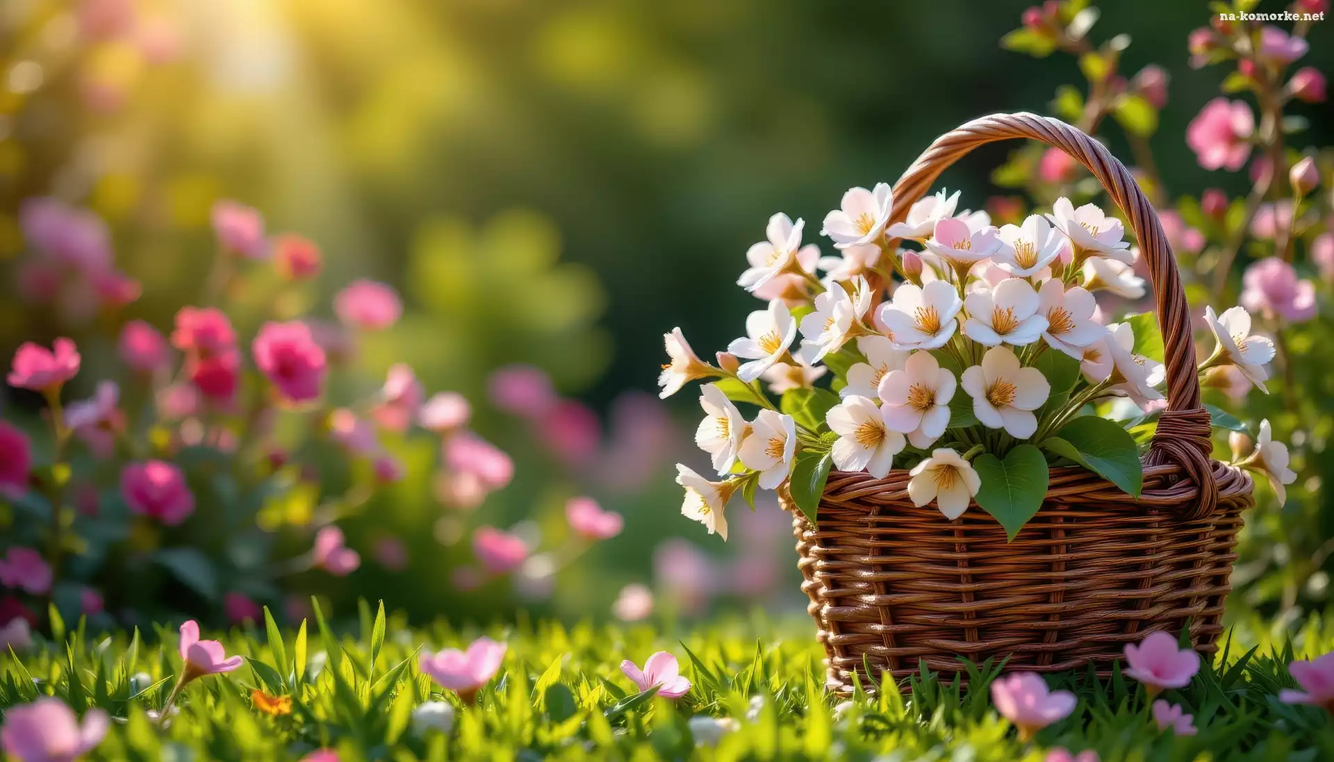 Koszyk, Białe, Wiklinowy, Trawa, Kwiaty, Różowe na Komórkę