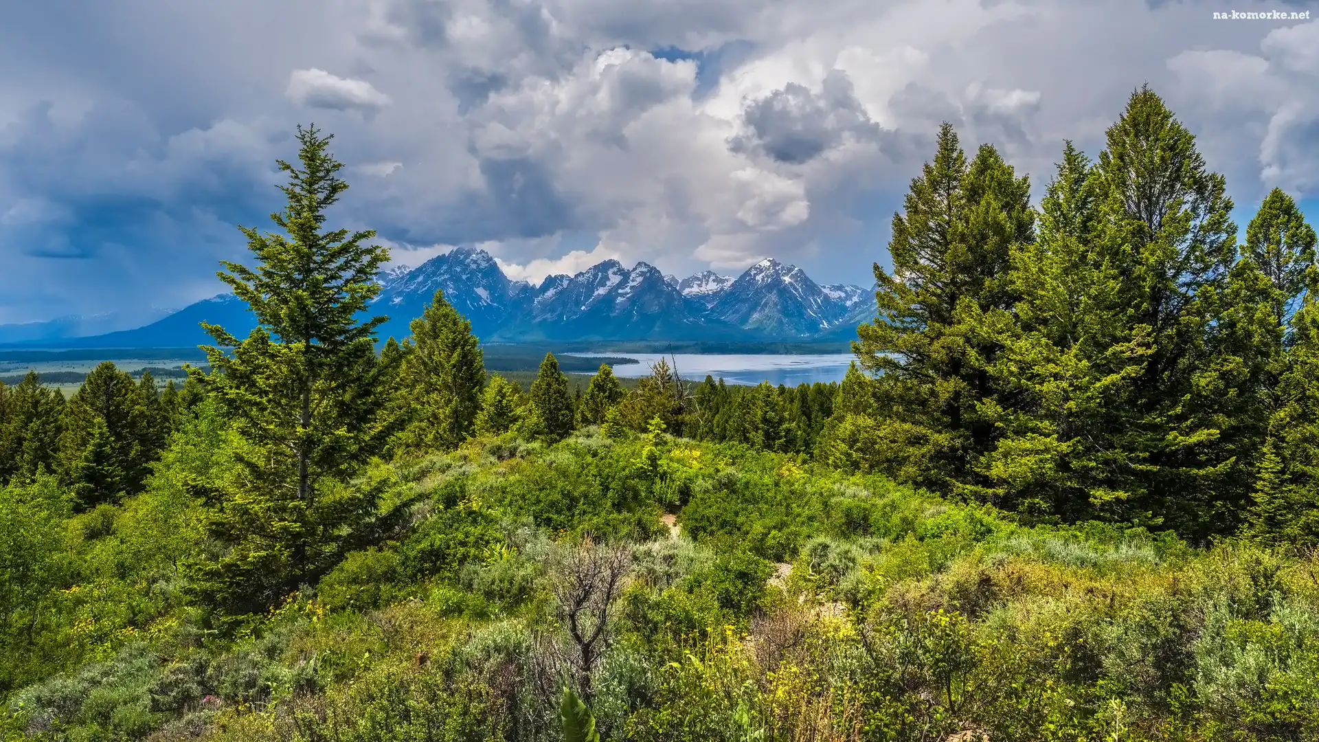 Jezioro, Stan Wyoming, Trawa, Góry, Park Narodowy Grand Teton, Stany Zjednoczone, Chmury, Drzewa na Komórkę |