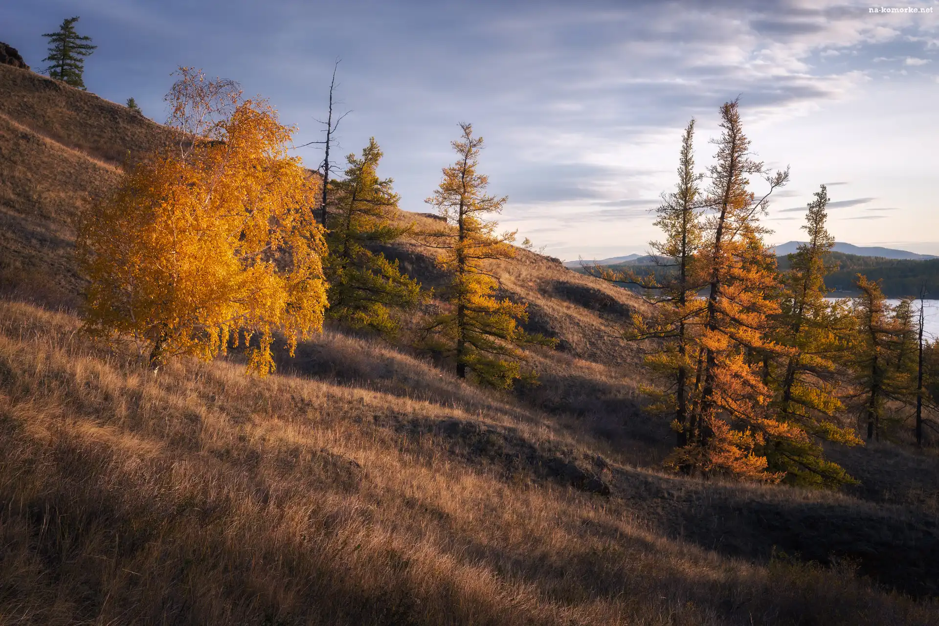 Trawa, Drzewa, Jesień, Góry, Wzgórza, Jezioro na Komórkę