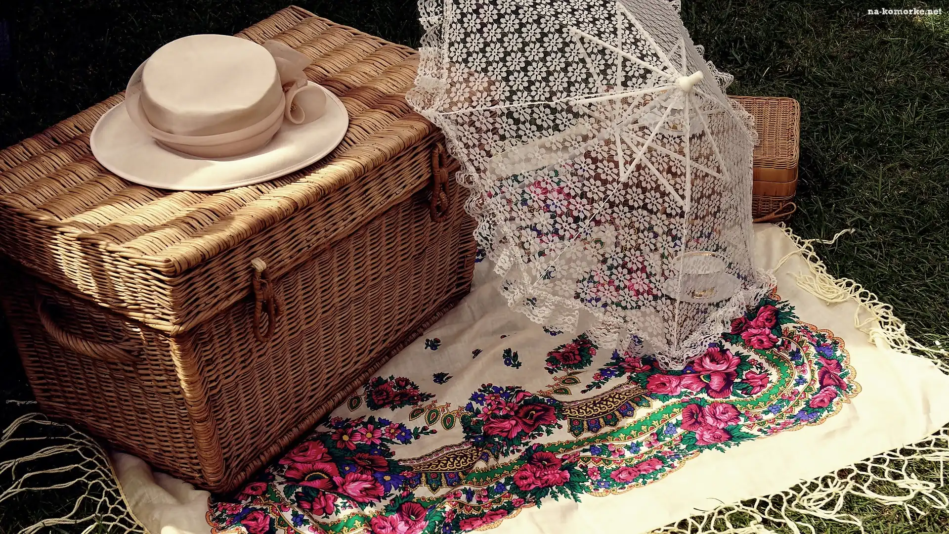 Parasolka, Trawnik, Kosz, Kompozycja, Wiklinowy, Skrzynia, Kapelusz, Chusta na Komórkę