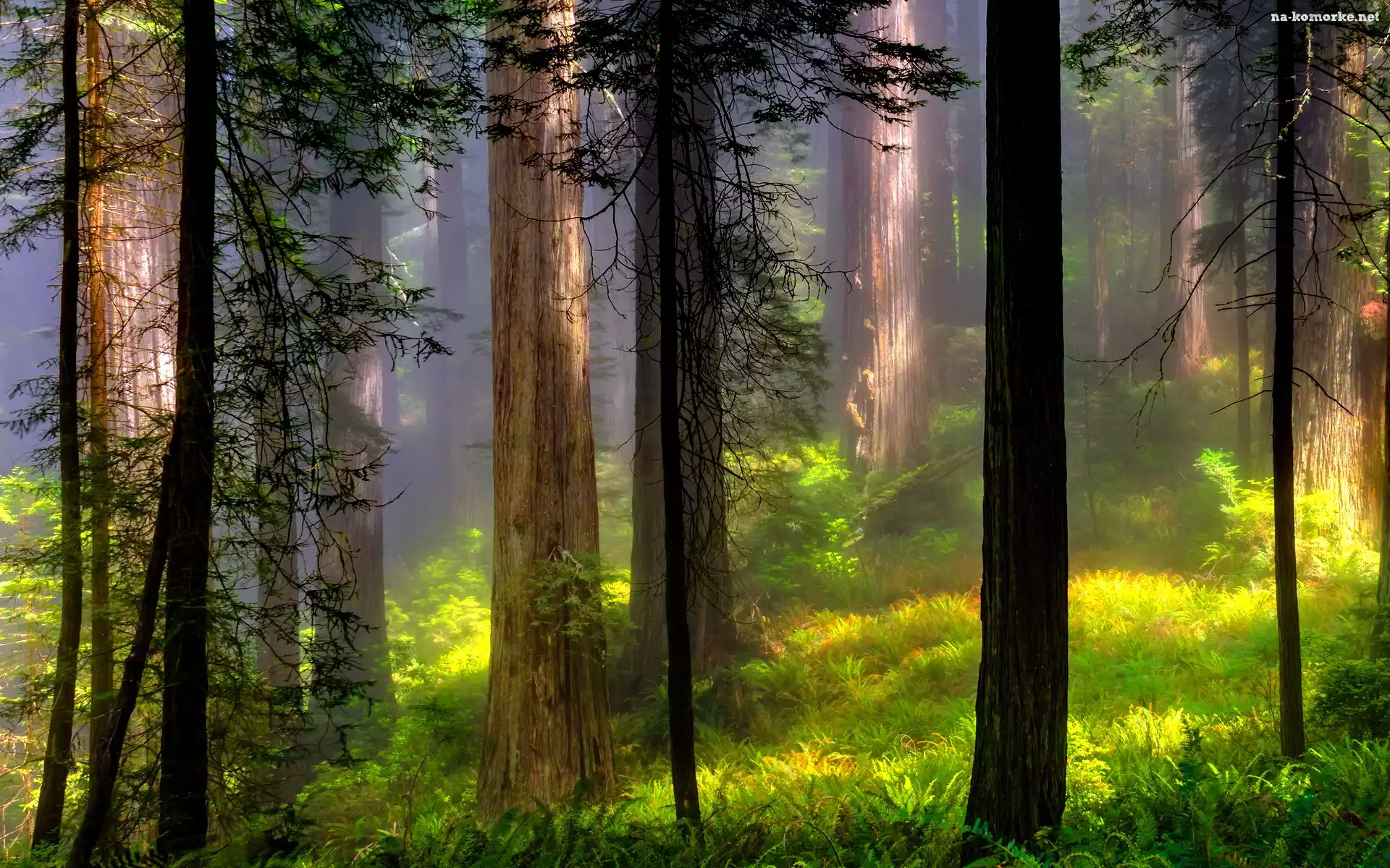 Las, Trawy, Wiosna, Przebijające, Światło, Mgła, Paprocie na Komórkę