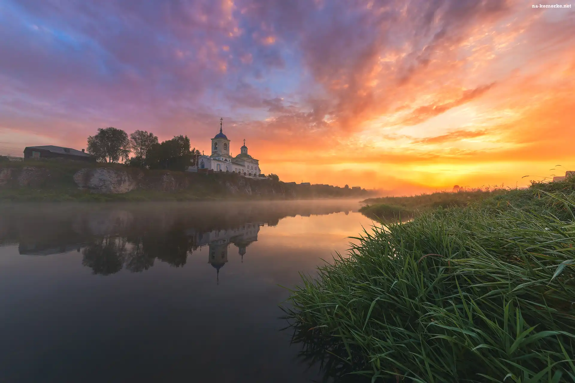 Trawy, Rzeka, Cerkiew, Wschód słońca, Mgła na Komórkę