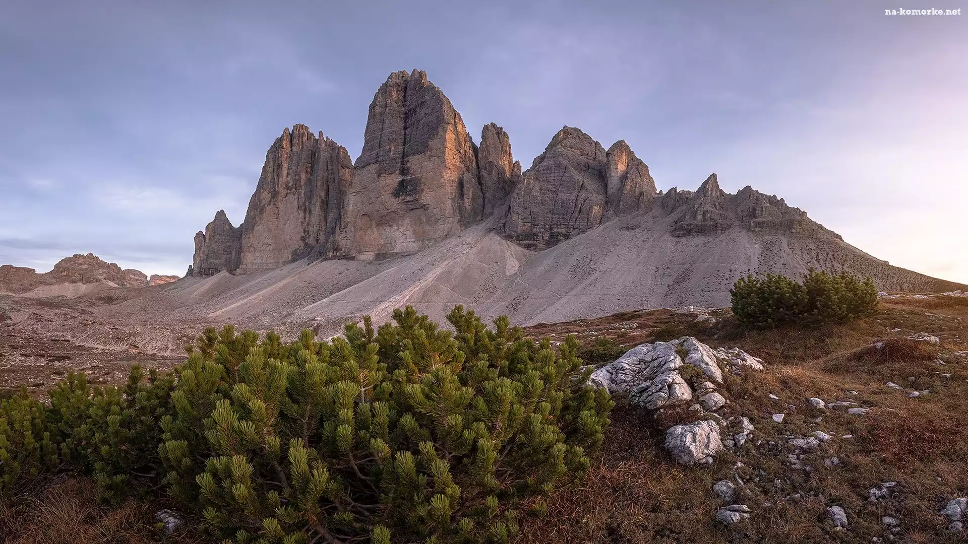 Szczyty, Roślinność, Skały, Góry, Iglaki, Włochy, Tre Cime di Lavaredo, Dolomity na Komórkę