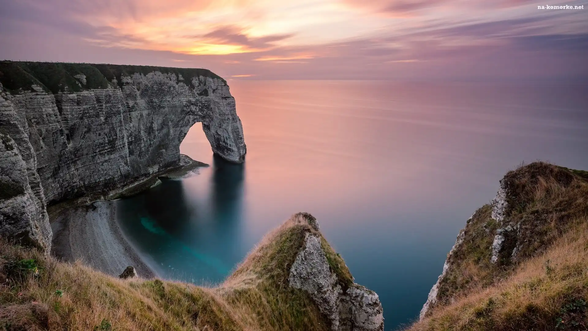 Francja, Morze, Łuk Manneporte, Étretat, Skały, Klif, Normandia, Kanał La Manche, Zachód słońca, Wybrzeże na Komórkę |