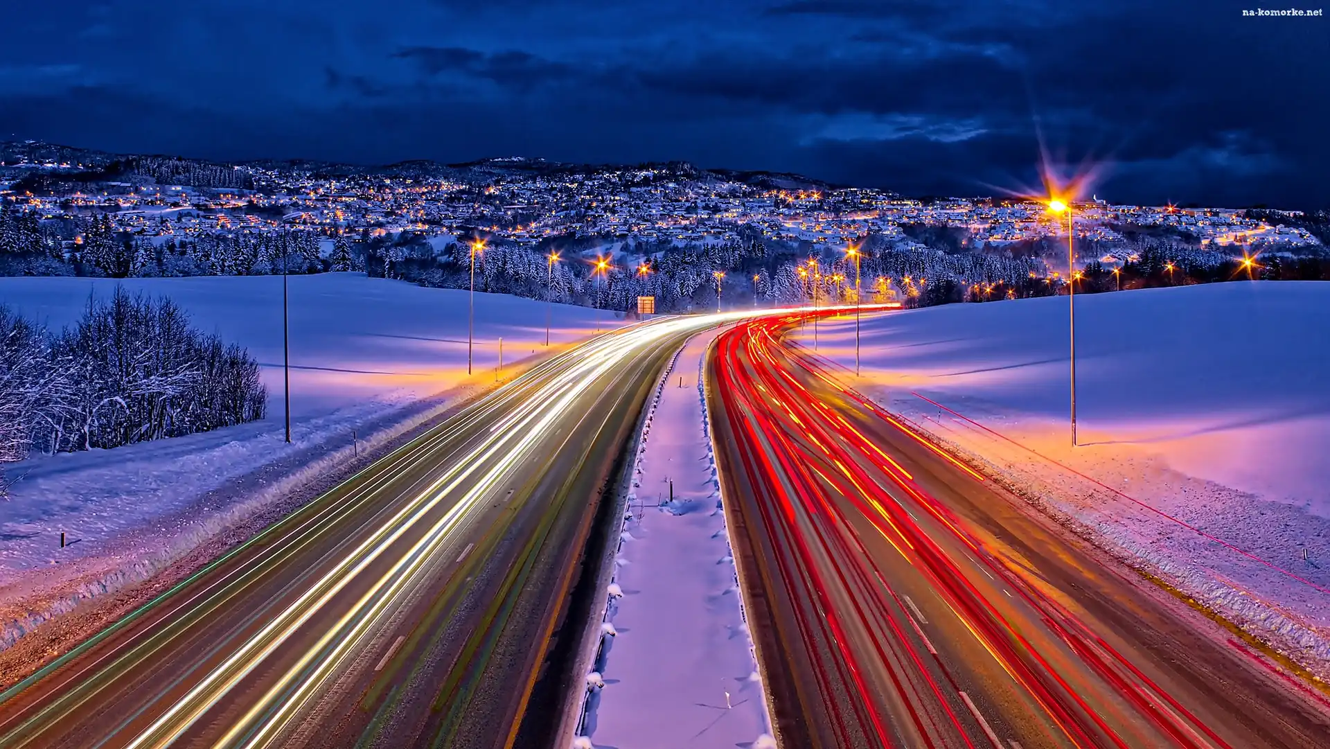 Trondheim, Droga, Zima, Norwegia, Panorama, Nocą na Komórkę