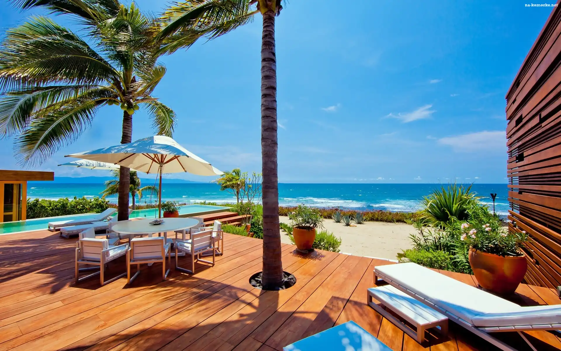 Leżaki, Hotel, Morze, Plaża, Wakacje, Basen, Wyspa, Palmy, Tropikalna na Komórkę