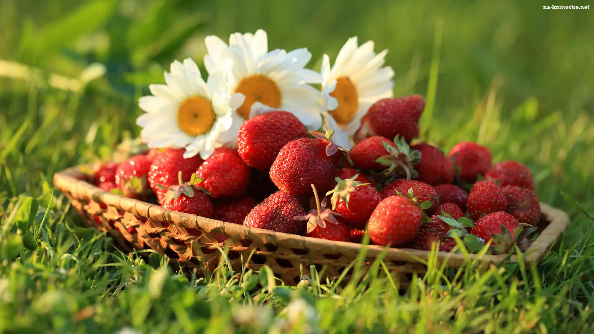 Wiklinowy, Truskawki, Kwiaty, Koszyk, Trawa na Komórkę