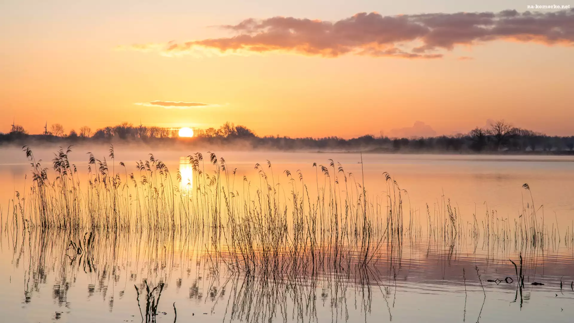 Jezioro, Wschód słońca, Trzciny na Komórkę