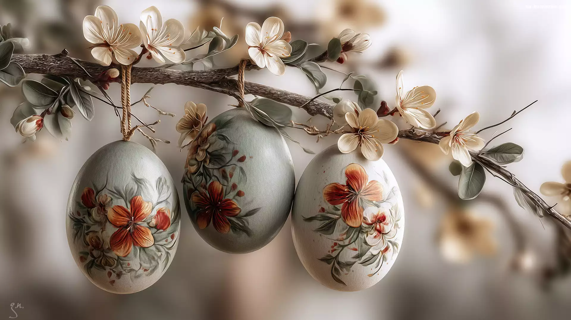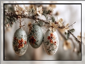 Białe, Kwiaty, Wielkanoc, Grafika AI, Pisanki, Gałązka, Trzy na Komórkę
