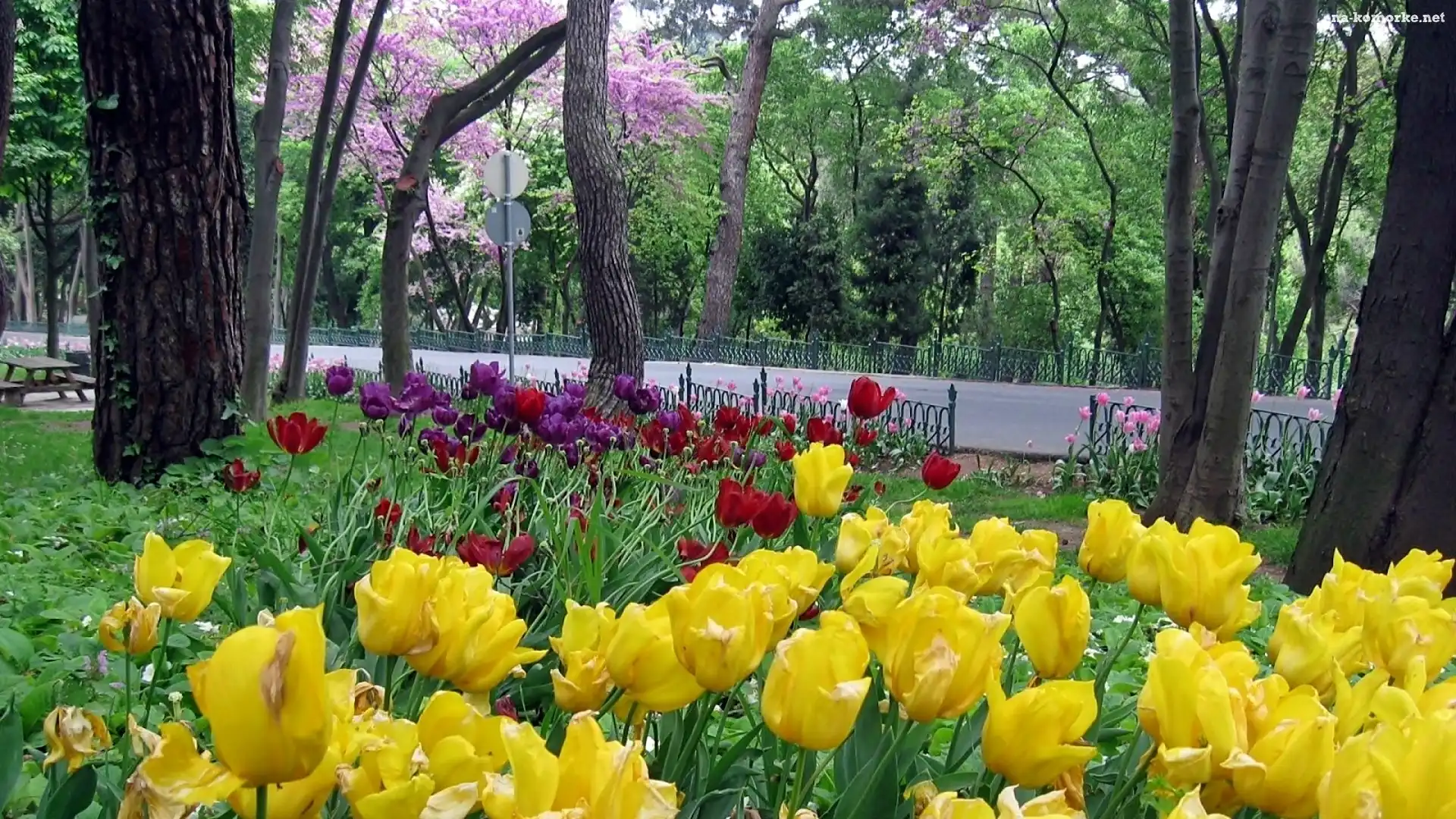 Fioletowe, Tulipany, Kosz Zieleń, Stawek, Ogród, Lato, Kwiaty, Park Wiosna, Łąka Wiosna, Park, Staw, Odbicie, Drzewa Zielone, Drzewo Wiosna, Kwitnące, Gałązki Park, Zieleń, Staw Żółte, Krokusy, Wiosna Zielone, Wiosenne, Liście Park, Deptak, Morze Park, Alejka, Drzewa Drzewa, Trawa, Liście Park, Alejki, Góry Tulipany