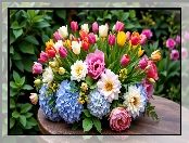 Bukiet, Tulipany, Hortensje, Kwiaty, Stolik na Komórkę