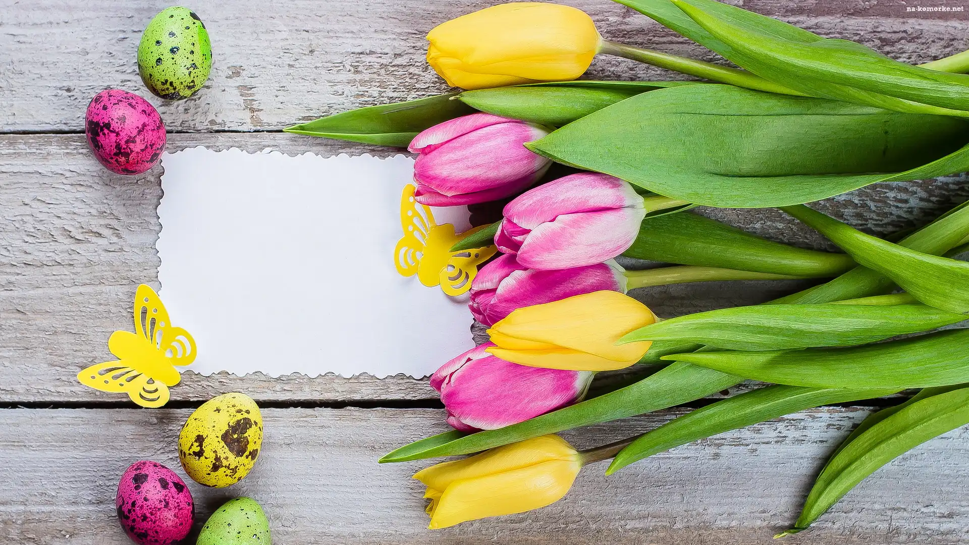 Tulipany, Pisanki, Wielkanoc, Deski, Kartka, Motyl na Komórkę