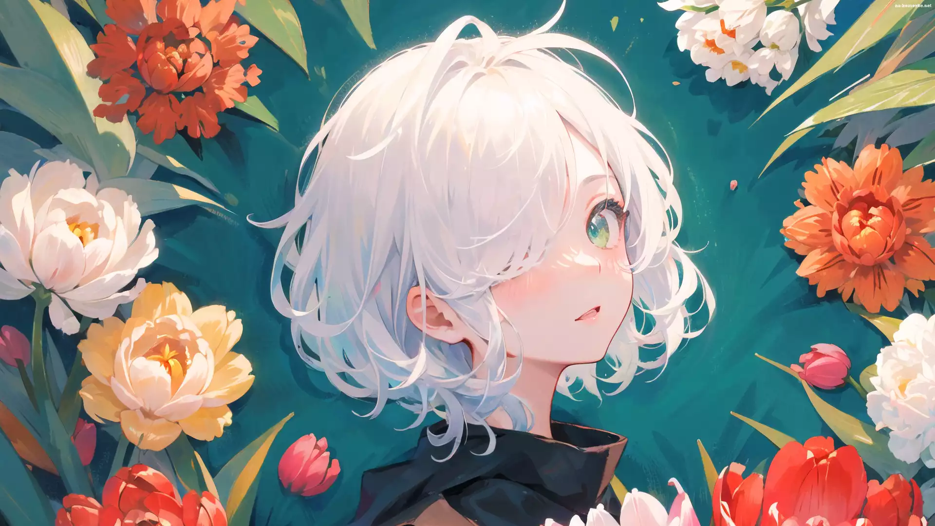 Dziewczyna, Tulipany, Kwiaty, Spojrzenie, Anime na Komórkę