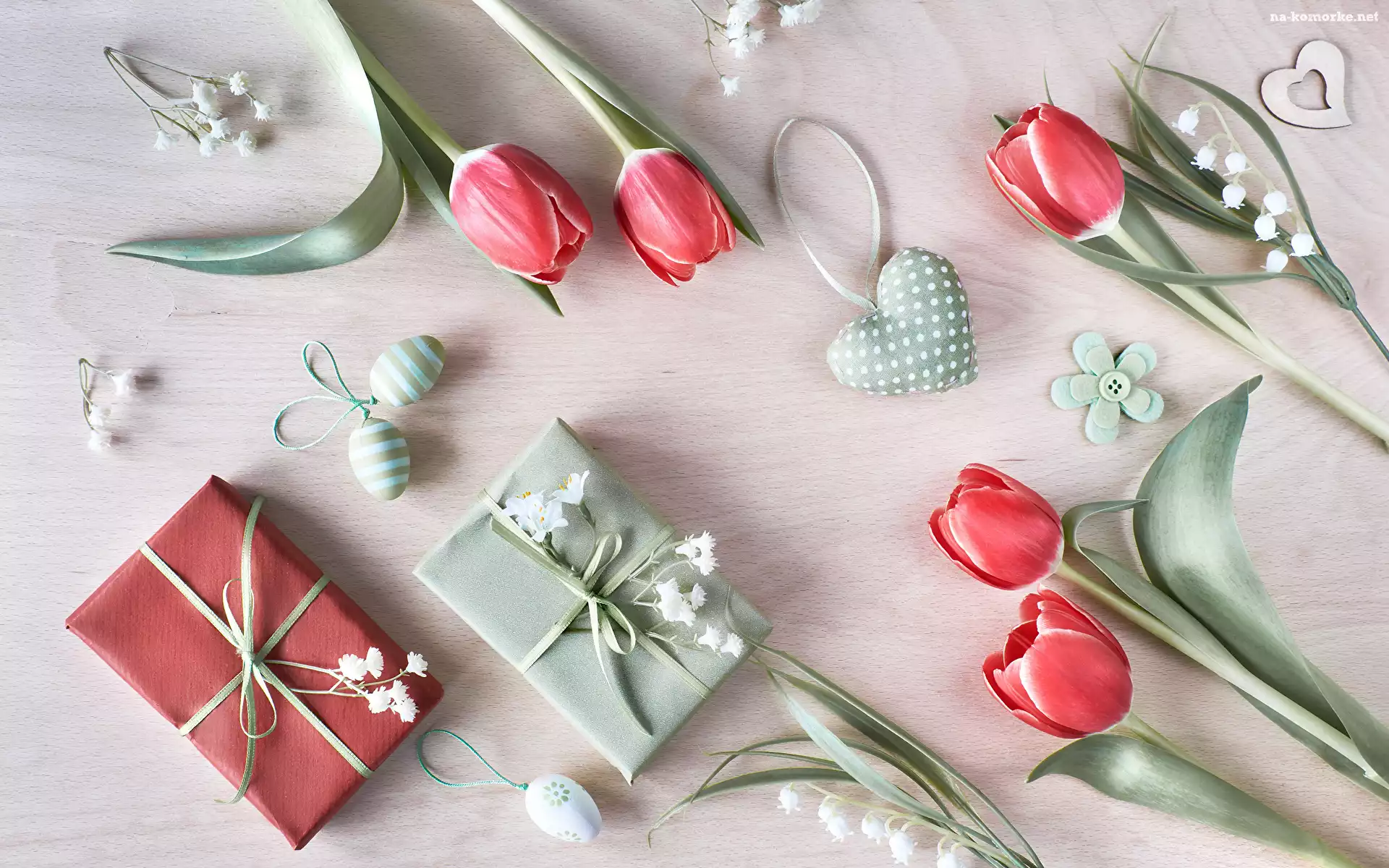 Pisanki, Prezenty, Kwiaty, Jasne tło, Konwalie, Serce, Tulipany na Komórkę