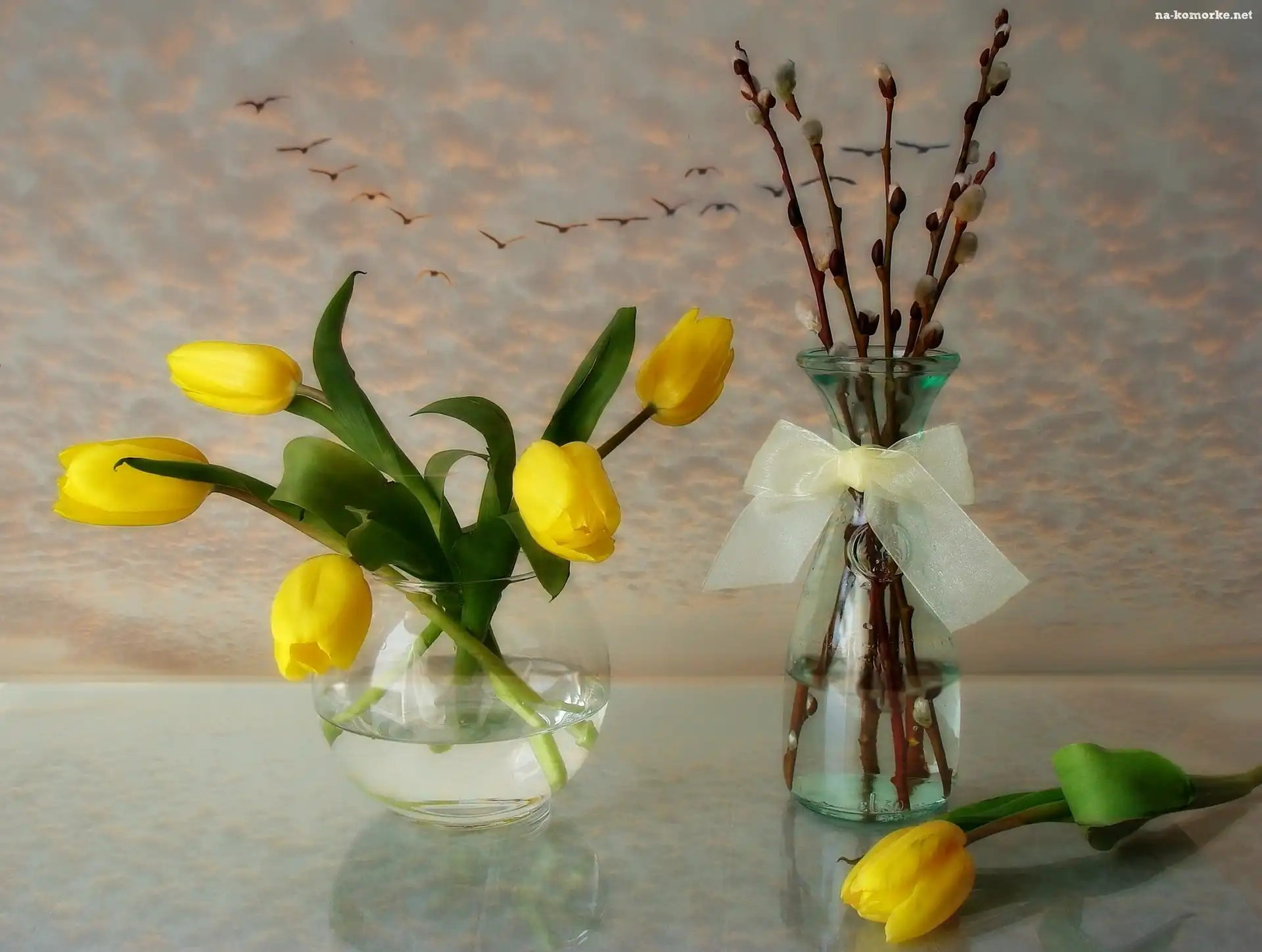 Tulipany, Wazony, Szklane, Bazie, Żółte, Wstążka na Komórkę