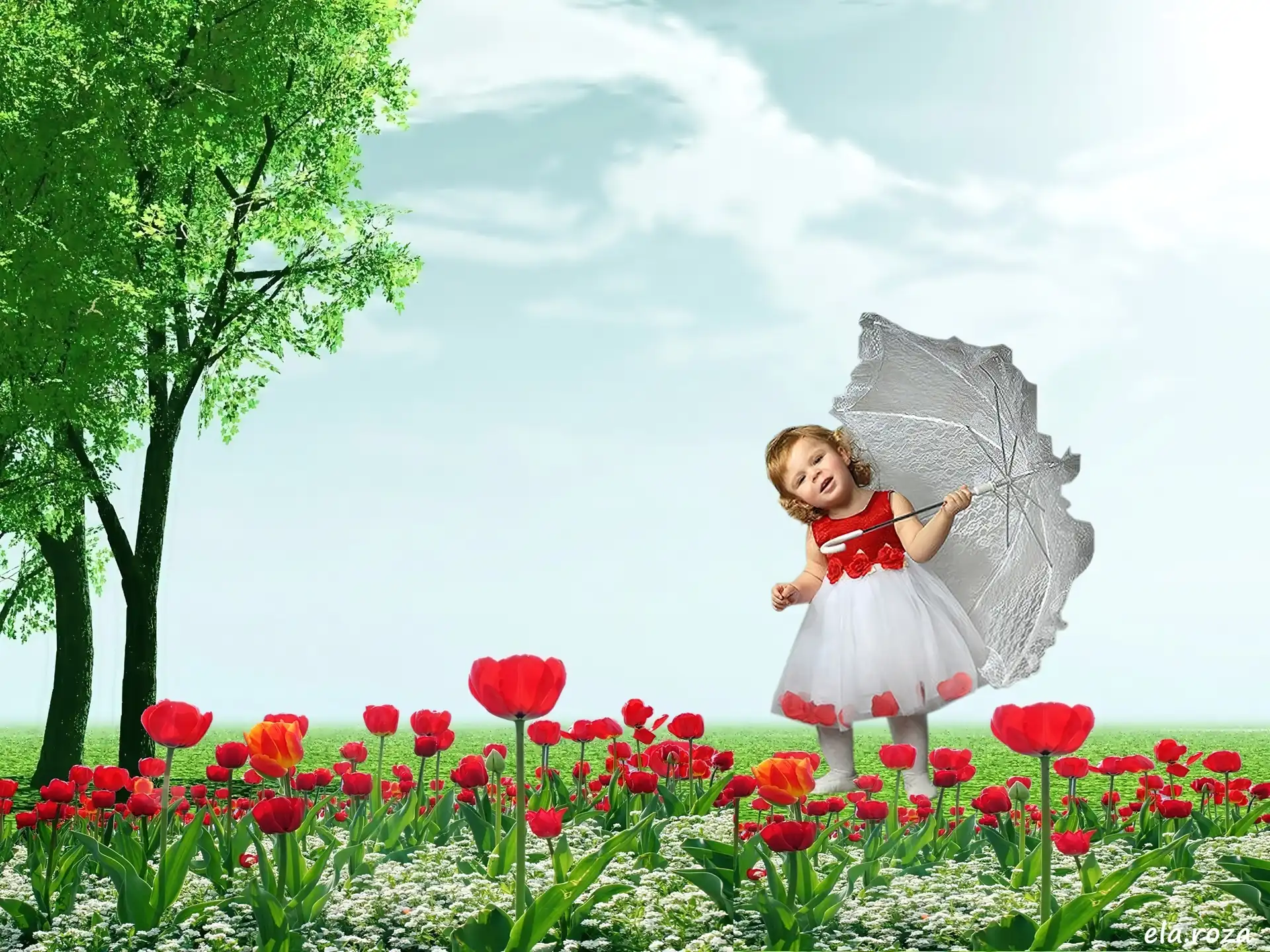 Łąka, Parasol, Tulipany, Dziewczynka na Komórkę