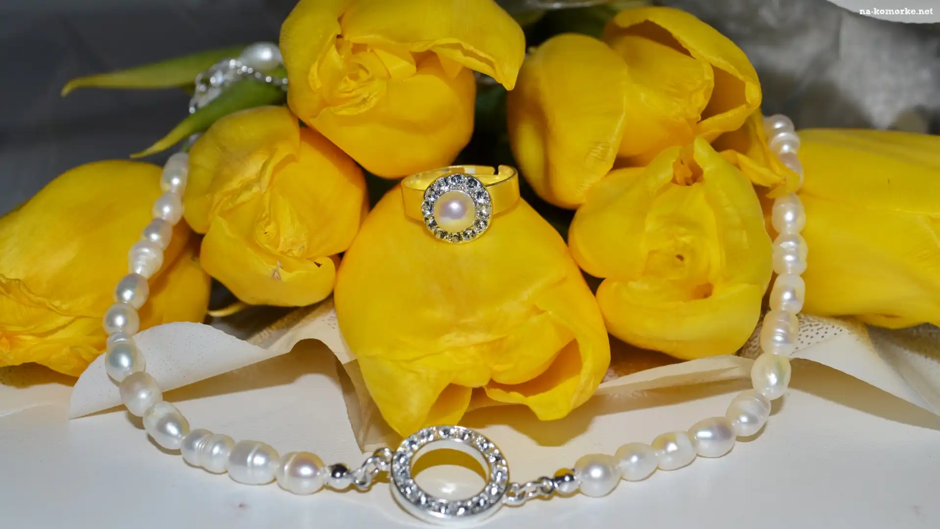 Żółte, Pierścionek, Tulipany, Perły na Komórkę