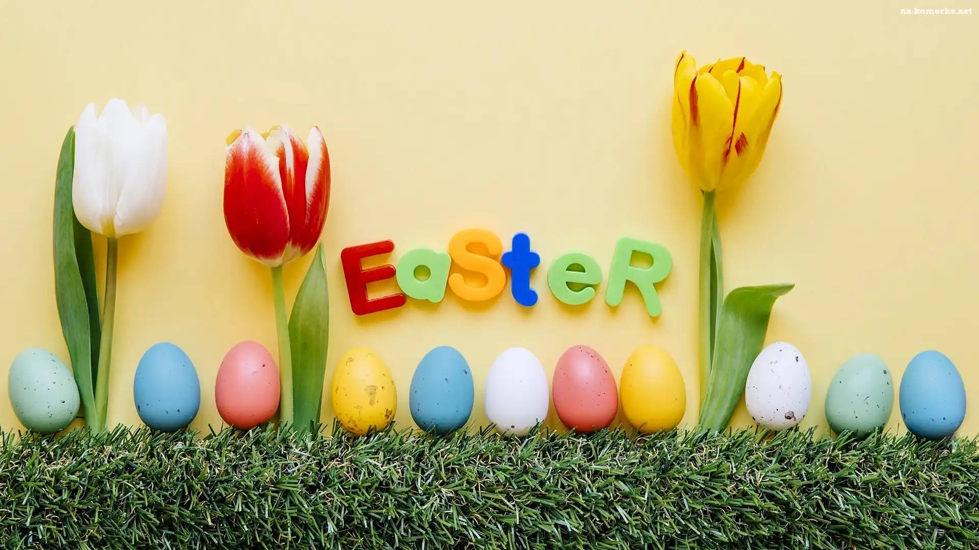 Tulipany, Wielkanoc, Pisanki, Trawa na Komórkę