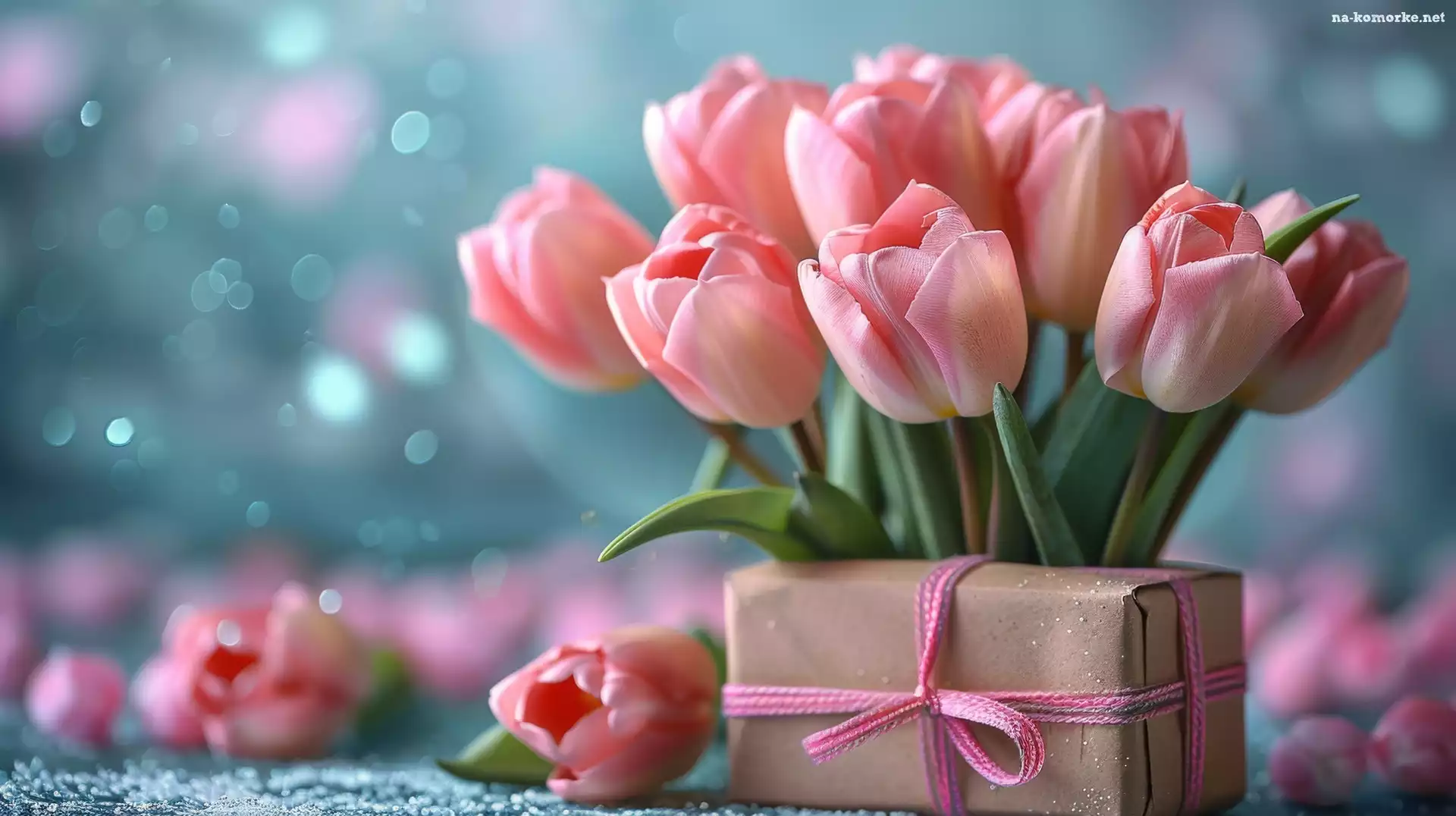 Kwiaty, Tulipany, Prezent, Różowe, Wstążka na Komórkę