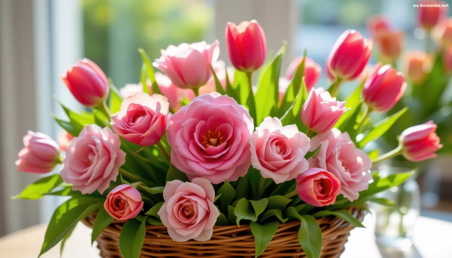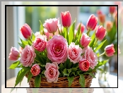 Kwiaty, Tulipany, Róże, Różowe, Koszyk na Komórkę