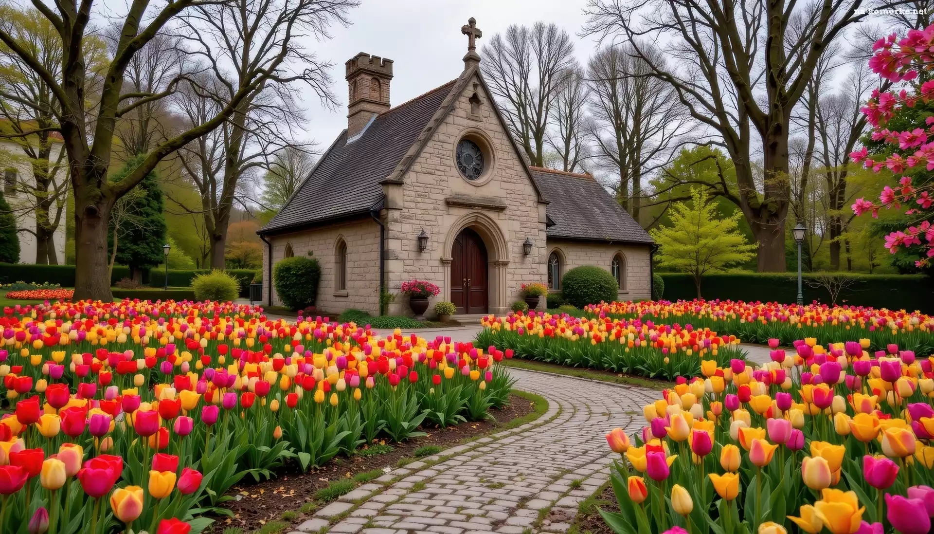Wiosna, Tulipany, Ścieżka, Kościół, Drzewa na Komórkę